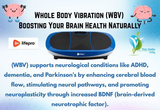 Boosting Brain Health Naturally Whole-body vibration (WBV) supports neurological conditions like ADHD, dementia, and Parkinson’s by enhancing cerebral blood flow, stimulating neural pathways, and promoting