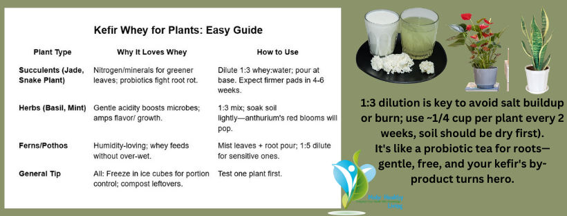 Using kefir whey for plant superfood status is one of my fave hacks—it’s a nutrient flush without the chemicals! 1:3 dilution is key to avoid salt buildup or burn; use ~1/4 cup per plant every 2 weeks, soil should be dry first).