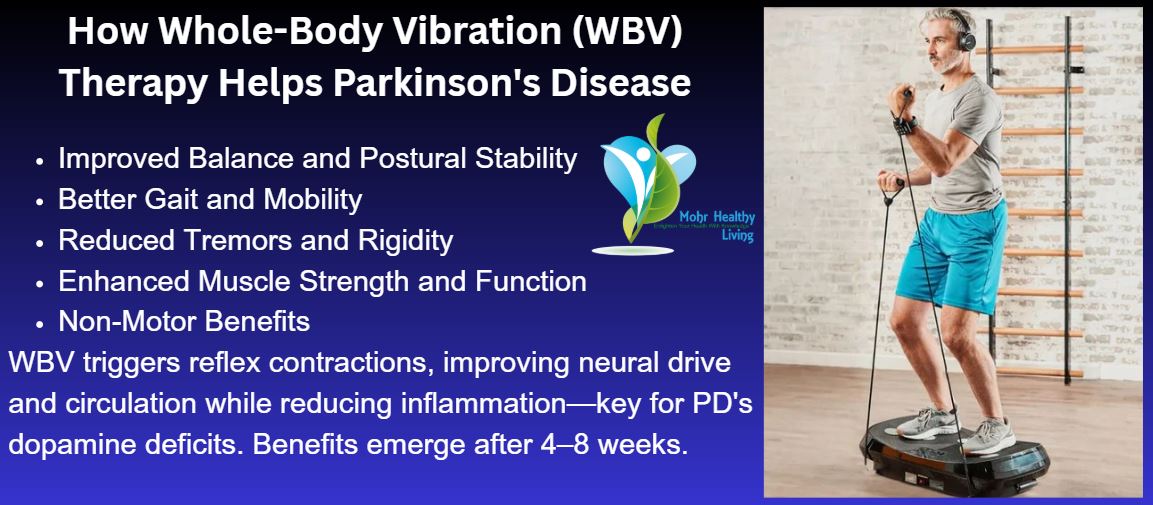 WBV triggers reflex contractions, improving neural drive and circulation while reducing inflammation—key for PD’s dopamine deficits. Benefits emerge after 4–8 weeks.